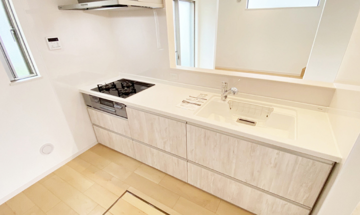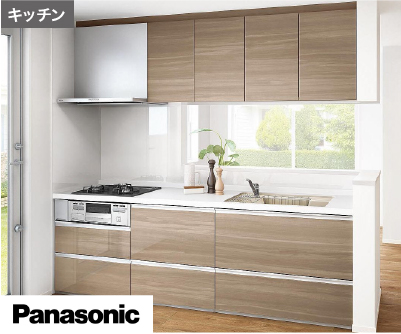 キッチンはパナソニック製システムキッチン。リビングやダイニング、コアガリベンチを見渡せ、家族とおしゃべりしながら食事の支度や片付けができます。