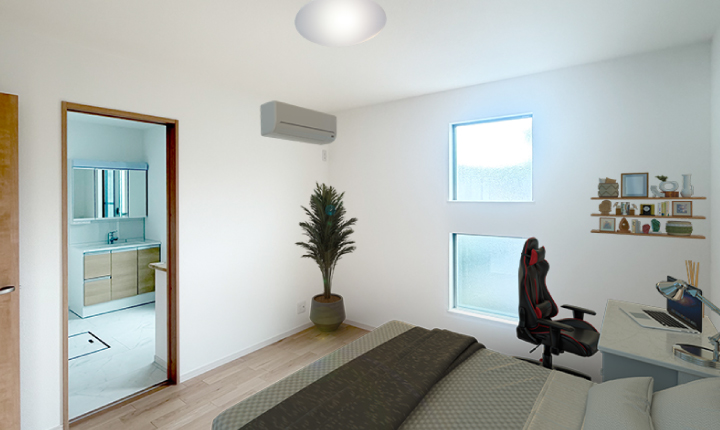 主寝室から洗面(ランドリー)室へ直接アクセス可能。洗濯動線のほか、入浴時や身支度の動線もスムーズで忙しい時間帯の時短が叶います。1.8帖大のウォークインクローゼットで収納力にも満足です。※実際の写真に家具等をCG合成しております