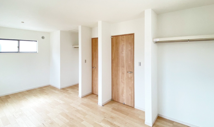 洋室は11.5帖の広さ。お子様の成長に合わせて、2部屋に区切ってお使いいただけます。ドアやクローゼットも各室に設けました。間仕切り壁設置工事は別途費用で請け負います。