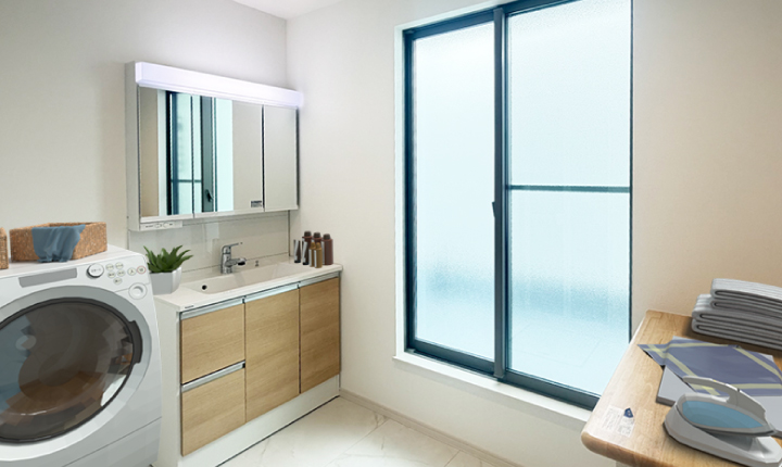 ランドリールームから主寝室、バルコニーへアクセスでき、収納までの最短動線を実現しました。バルコニーには外壁を設置し、外からの視線をシャットアウト。洗濯物をいつでも干せると共に湯上りタイムも寛げる、本物件ならではの安楽さをお愉しみいただけます。※実際の写真に家具等をCG合成しております