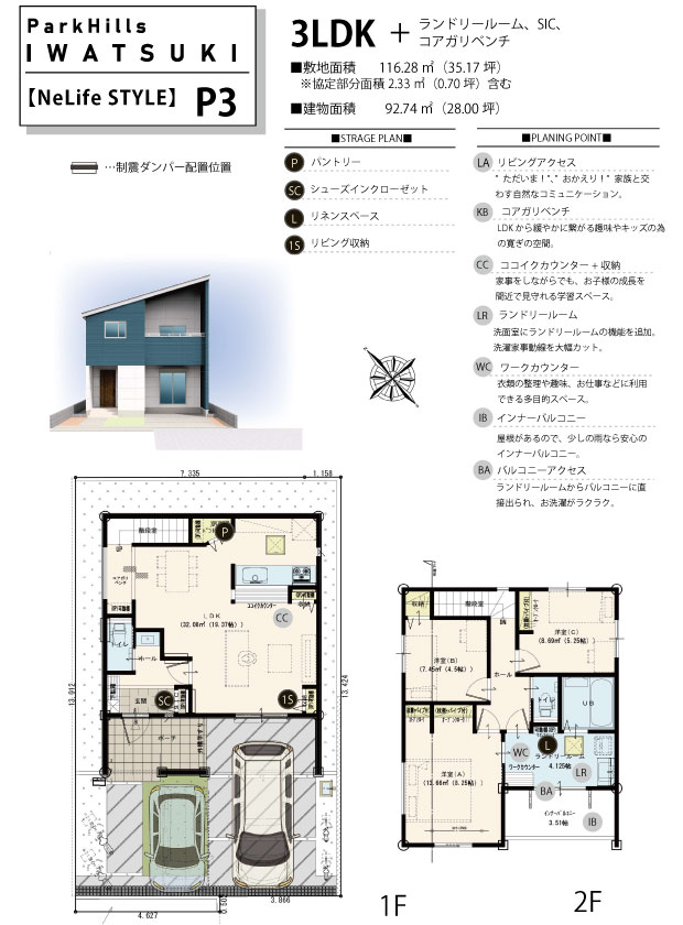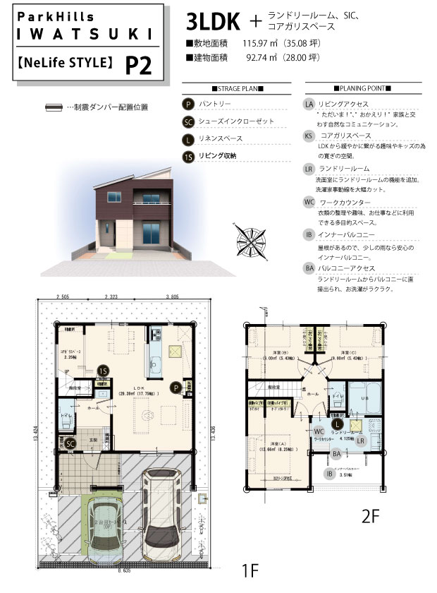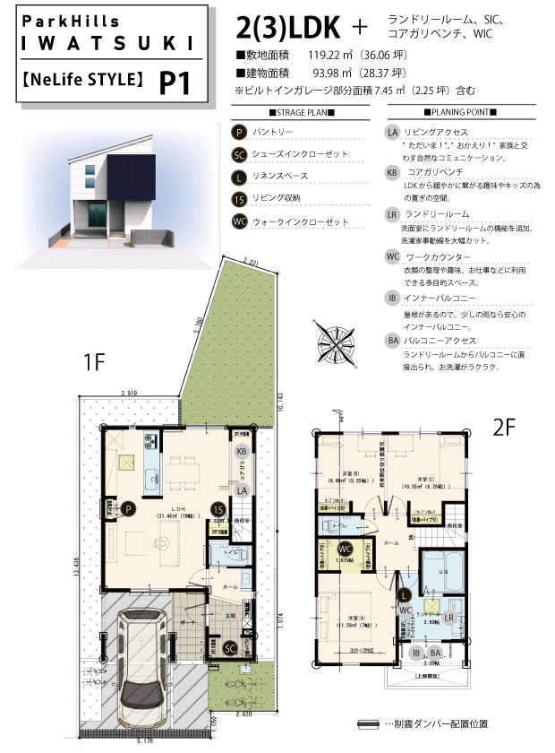 | 延床面積 | 93.98㎡(28.37坪)P1号棟:ビルトインガレージ面積7.45㎡(2.25坪)含む |