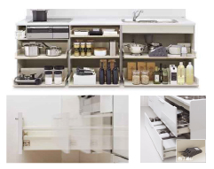 フロアユニットスライドタイプで、静かに閉まるソフトクロージング機構。深型のフロアストッカーには調味料やパックを⽴てて収納できます。