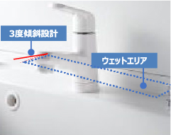 お掃除に配慮したカウンター水栓まわりを3度傾斜をつけて水が残りにくい設計に。また、濡れたものの置き場所にウェットエリアをご用意。