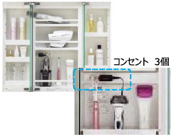 すっきり家電収納毎日使う美容家電を使いやすくすっきり収納。収納内部にコンセントを2個設置。バッテリー切れや充電中の出しっぱなしをなくせます。