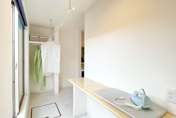 カースペース2台と庭付の広い敷地。バルコニーに接したランドリールームで楽々洗濯。