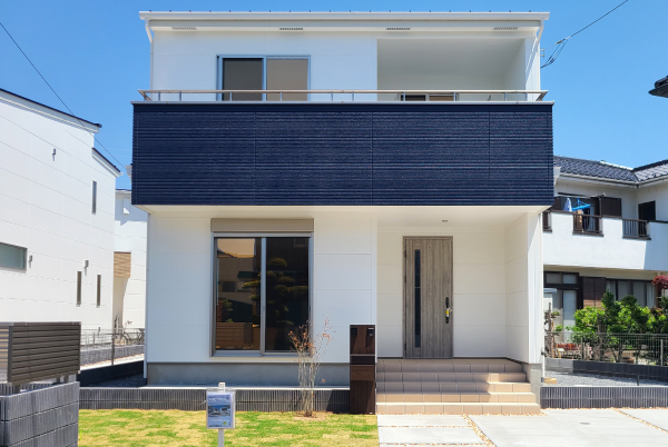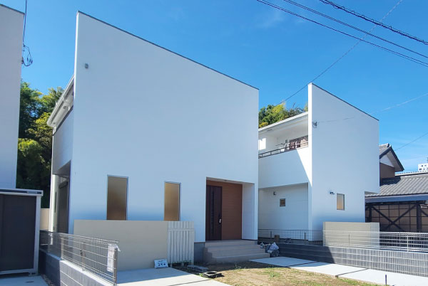 真っ白な外壁と緑の芝生が青い空に映えるデザイン住宅。収納充実、マルチコーナーのある間取り。