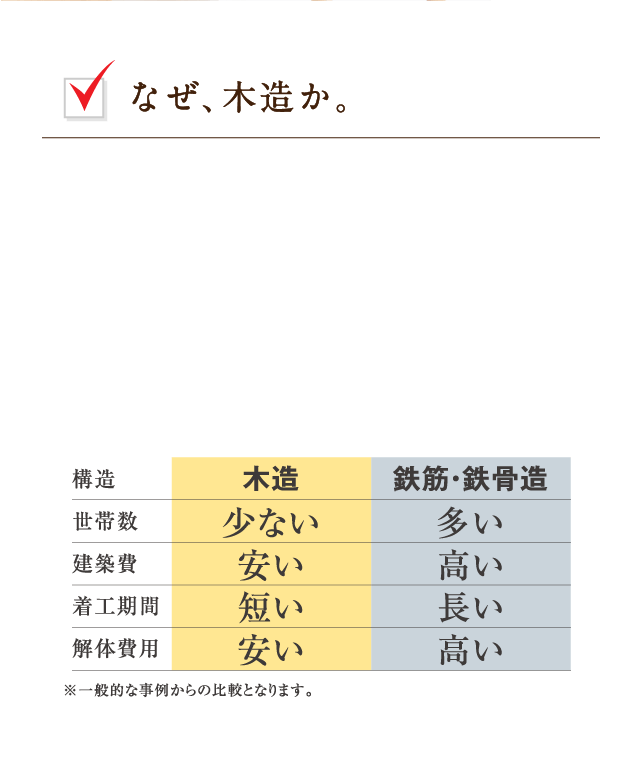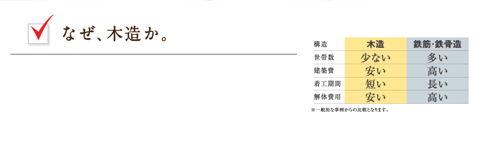 木造建築は施工費が安く、着工期間が短いばかりでなく、耐用年数を過ぎた後の解体工事もコンクリート造の建物とは比較にならないほど簡単で、廃材も少なくて済みます。