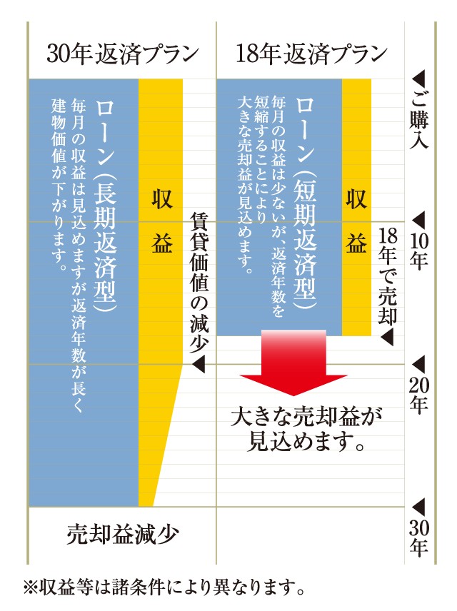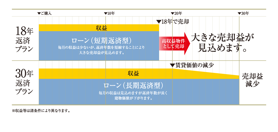 三井開発では、物件が高い収益をあげている時期にローンを完済し、大きな売却益を得るプランをおすすめしています。