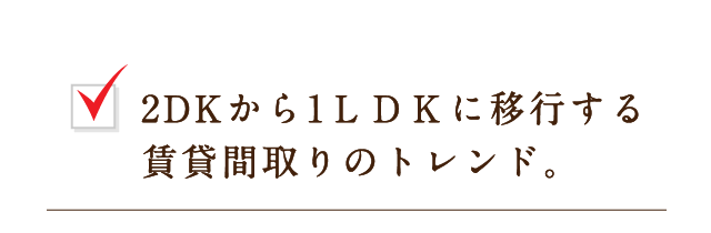 現在のアパートでは、一般的な賃貸間取りとして人気のあった2DK、3DKから、キッチンを一体化した大きなリビングダイニングのある1LDK、2LDKへと賃貸需要が変化しています。