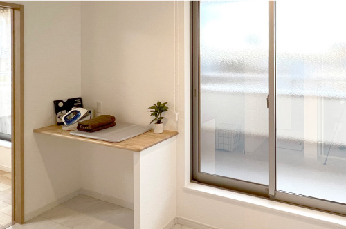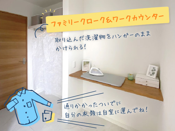 洗濯動線上に取り込んだ洗濯物を畳んだり、整理仕分けできるワークカウンターを設置。