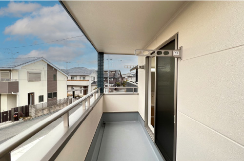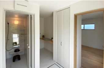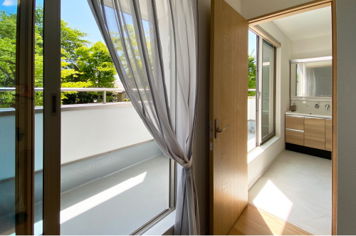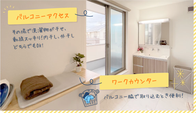 洗面室がバルコニーと直結しているので濡れて重たい洗濯物を持って階段を昇る事がなくなります。室内物干(別途工事)を設置すれば時間やお天気を気にせず、室内、室外どちらにも干せ、ストレスが無くなります。