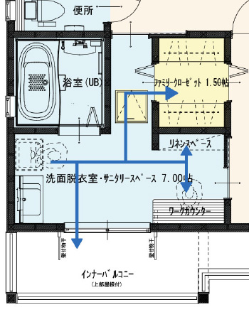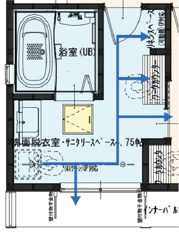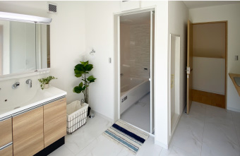 身支度動線は各自の部屋と水回りが近いとラクに感じると言われています。2階フロアに洗面・浴室があるプランはお出かけや就寝までの動線が短く機能的です。