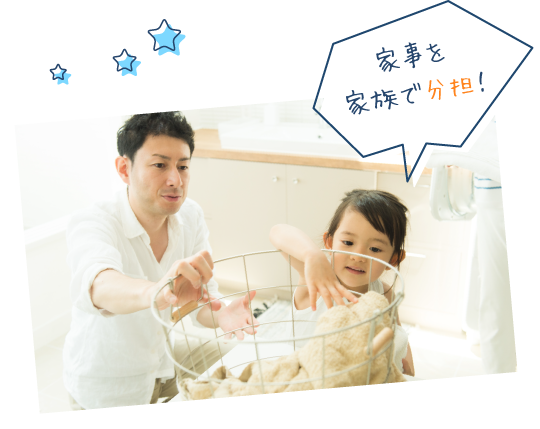 家の収納場所を見直し、共有エリアに家族それぞれの収納スペースを作ることにより、各自の収納意識が働き、家事の分担化が図れます。
