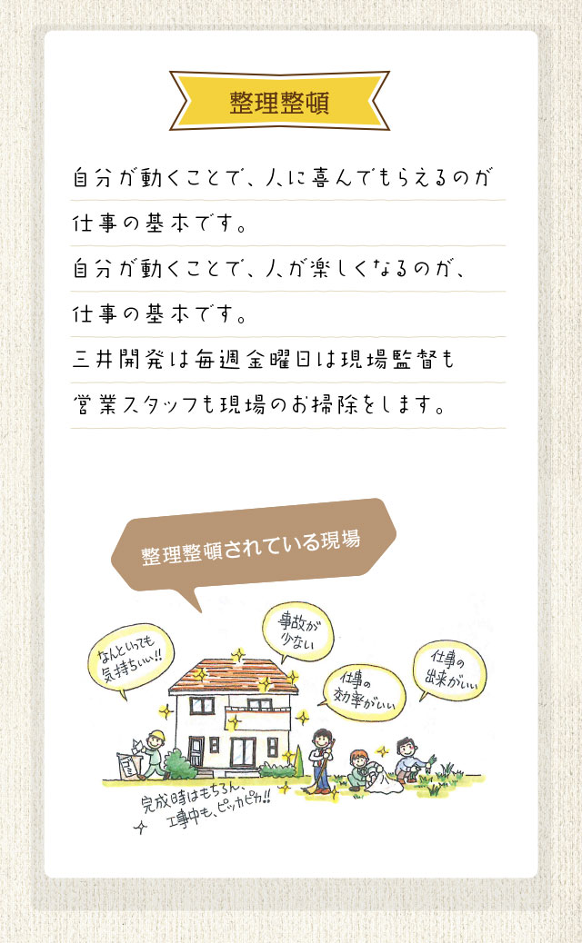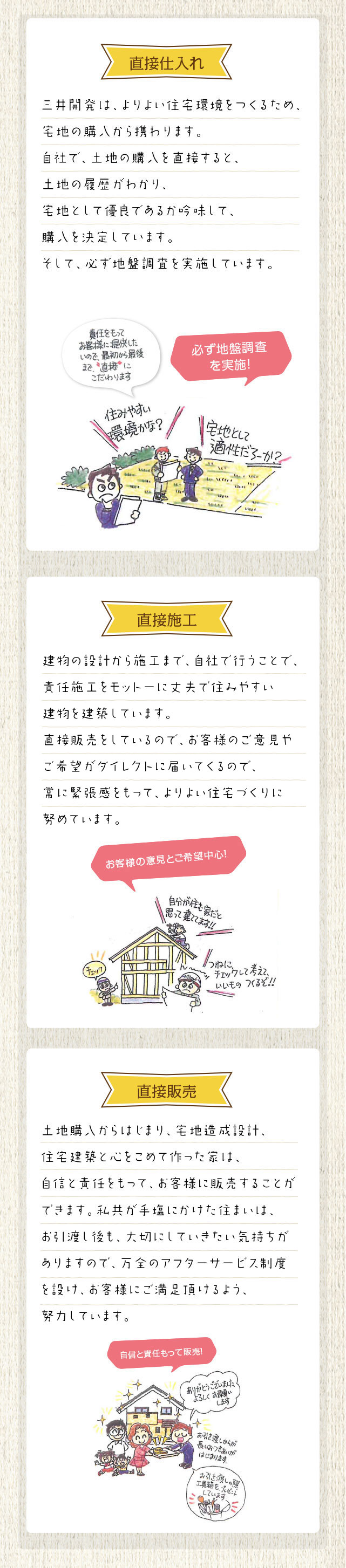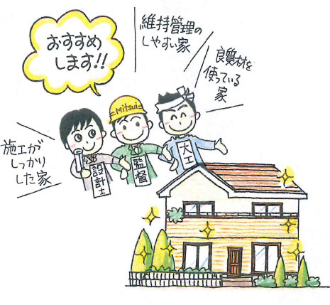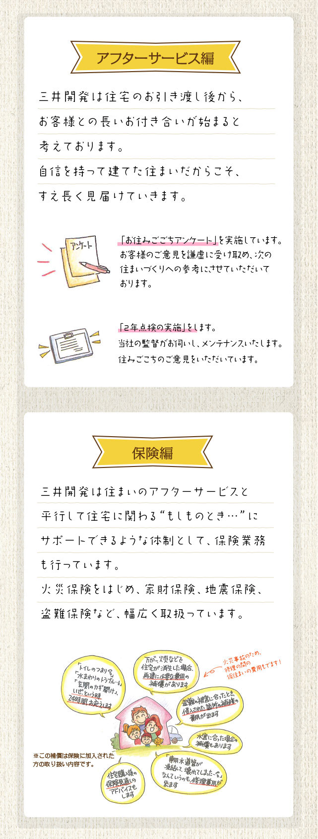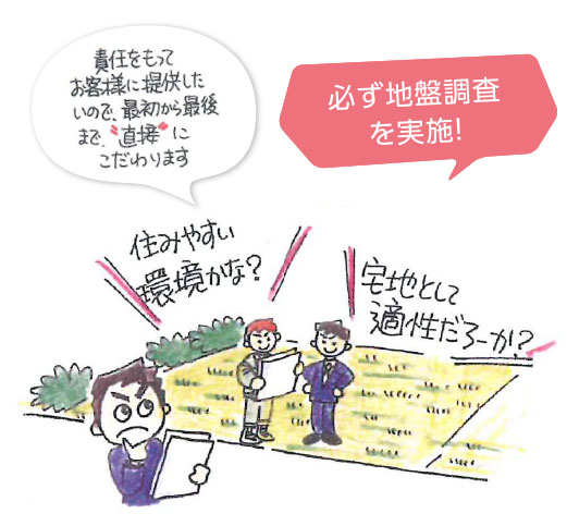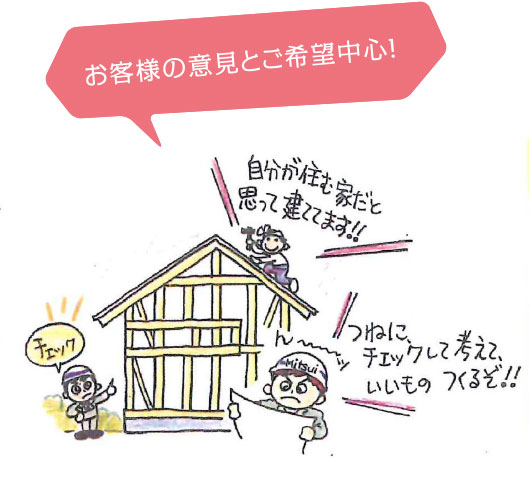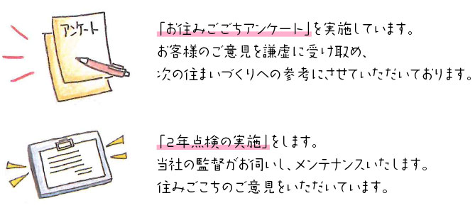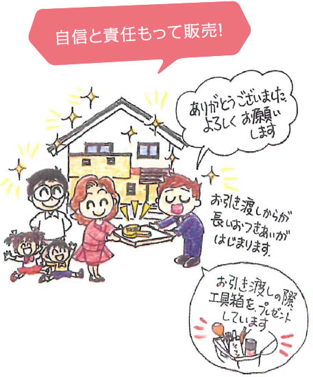 ことができます。私共が手塩にかけた住まいは、お引渡し後も、大切にしていきたい気持ちがありますので、万全のアフターサービス制度を設け、お客様にご満足頂けるよう努力しています。