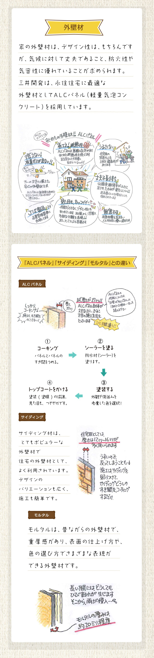 三井開発は、永住住宅に最適な外壁材としてALCパネル(軽量気泡コンクリート)を採用しています。