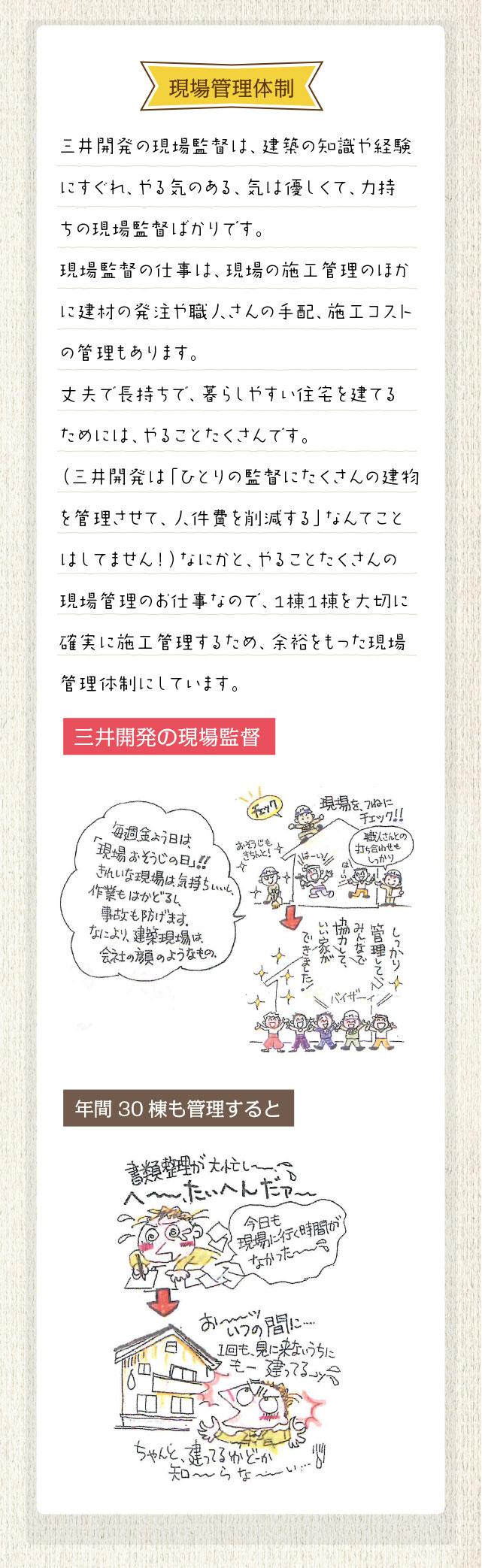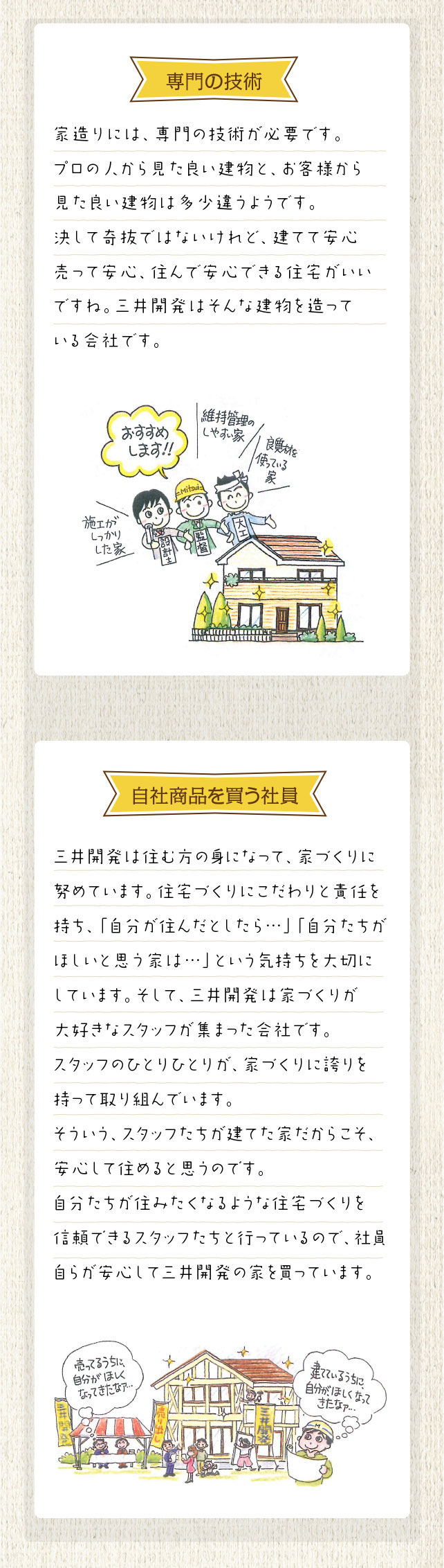 そして、三井開発は家づくりが大好きなスタッフが集まった会社です。スタッフのひとりひとりが、家づくりに誇りを持って取り組んでいます。そういう、スタッフたちが建てた家だからこそ、安心して住めると思うのです。