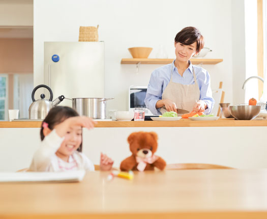 新しい家族が増えることは大きな幸せのひとつ。ただ子どもが小さいころは目を離すことができません。暮らしの中心にある広く開放的なリビングは、どこからでも見渡すことができ、家事をしながらでも子どもに目が行き届く、安心した子育てができます。