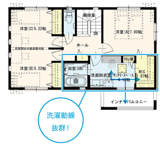 思い切って水回りを2階に配置することで、洗濯動線が劇的にスムーズに!