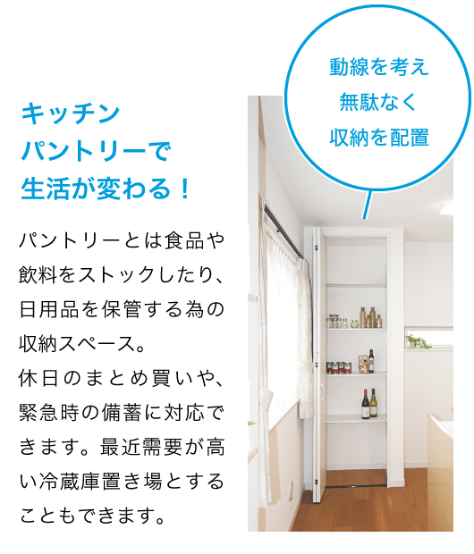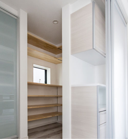 収納にゆとりがあるからこそ、取り入れられる「リネン庫」や「パントリー」。家事動線上に、必要な収納スペースを設けているので、より家事をスムーズに行うことができます。