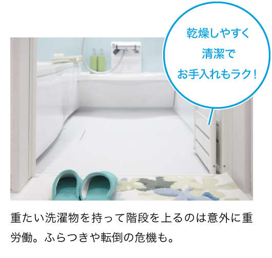 いままでは洗濯物を持って階段を上がっていたのが、2階に洗濯機やお風呂など水回りを配置することによって洗濯動線が改善!