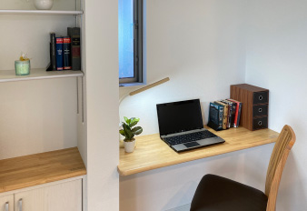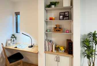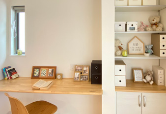 ダイニングの一角、キッチンから目が届く場所にお子様の為の学習&収納スペース「ココイクコーナー」を設置。家事をしながらお子様を見てあげられます。 テレワーク時にはお子様を見ながらのお仕事に対応。仕事の資料やパソコンの収納やプリンターの設置にも重宝します。