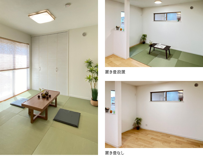 リビングの一角に置き畳を設置。お子様が寝転がって遊べるのでプレイスペースやオムツ替えスペースとしてご利用頂けます。 畳は取外し可能。間仕切りを設置して(別途工事)独立性の高い書斎やテレワークスペースとする事もできます。