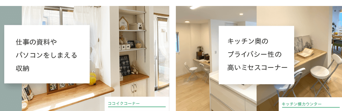リビングダイニング内に収納とカウンターが設けられた「ココイクコーナー」は、