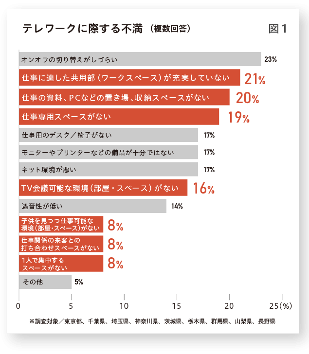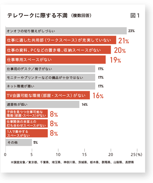 2020年2月リクルート住まいカンパニーが公表したテレワークに関する意識・実態調査の「テレワークに際する不満(図1)」をみると、仕事を行うスペースに不満が集中していることがわかります。