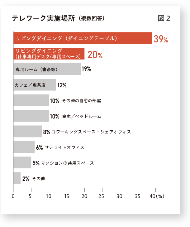 さらに「テレワーク実施場所(図2)」をみると、多くの人がダイニングテーブルや専用スペースなど、リビングダイニングを仕事場としていることがわかります。つまり、快適なテレワークを実現するには、リビングダイニングの充実がカギといえるのです。