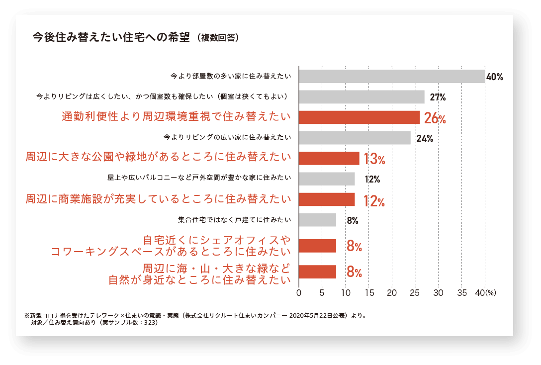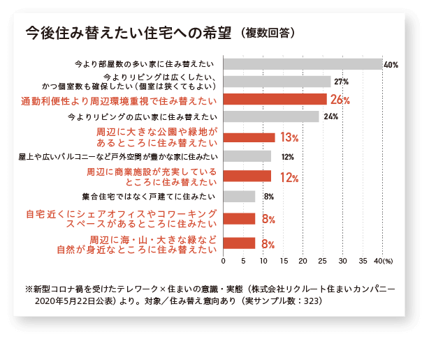 リクルート住まいカンパニーが2020年5月に公表した調査によると、テレワーカーのうち24%の人が、 テレワークが続くなら住み替えを検討する、と答えています。 暮らしたい場所はどのような傾向があるのでしょう?